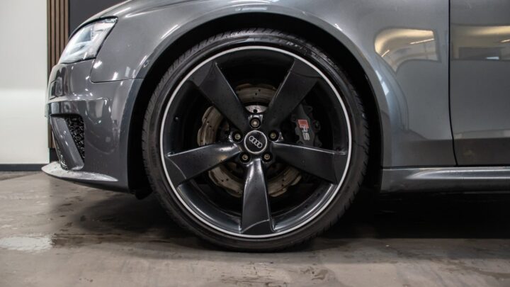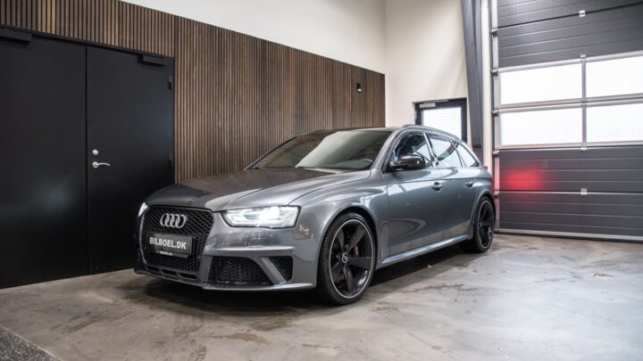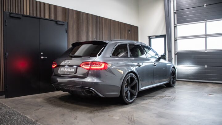 Fuldstændig gennemført og legendarisk Audi RS4 med den eminente 4,2 liters V8 sugemotor, Quattro firehjulstræk og Daytonagrå metallak.
