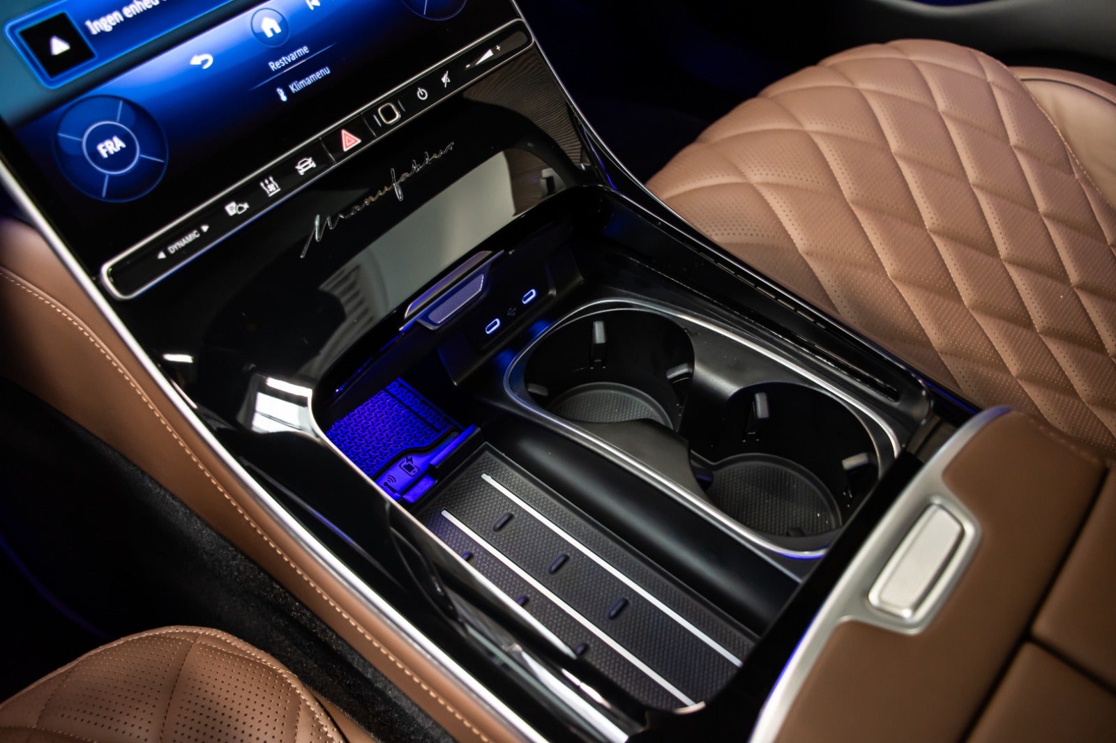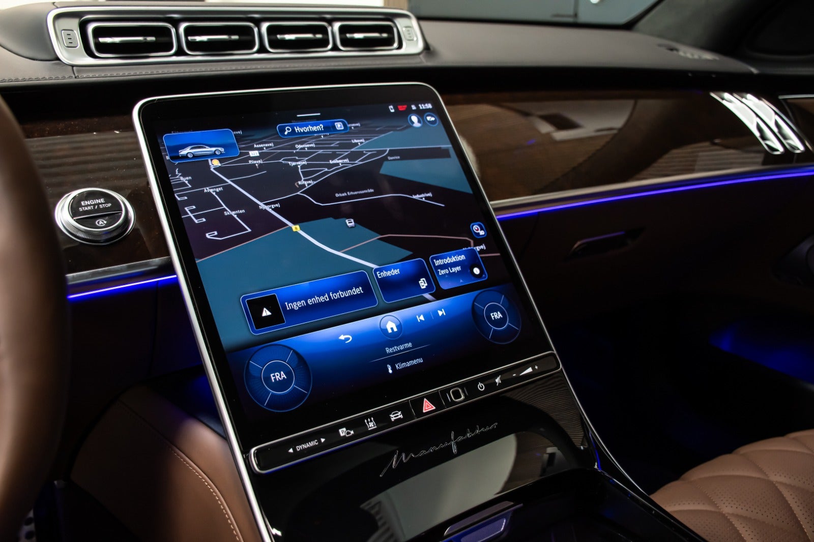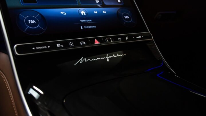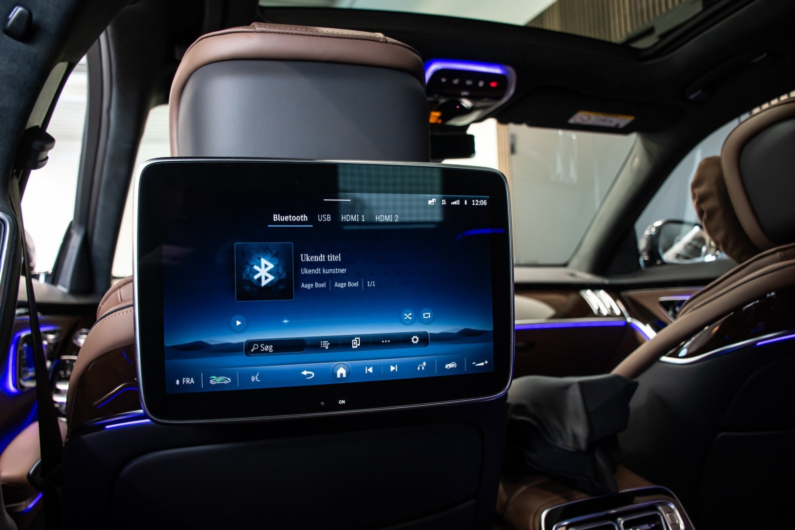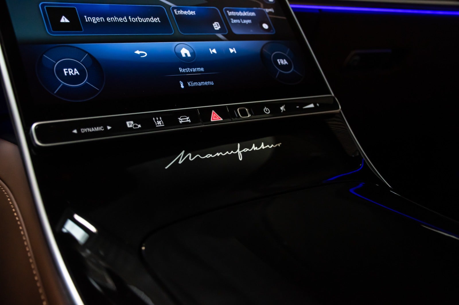 Indvendig kan du tage dig til takke med de store og overdådige Business Class sæder i bag m. varme, køl, massage og selvfølgelig memory. Skal du arbejde, slår du blot cafébordet ud, og trænger du til at se nyheder eller blive underholdt, tænder du blot for MBUX skærmene. Kabinen er prydet med MANUFAKTUR syninger og læder i den særlige MOCCA-brown, og sammen MANUFAKTUR listerne i brun valnøddetræ er det virkelig en perfekt kombination.