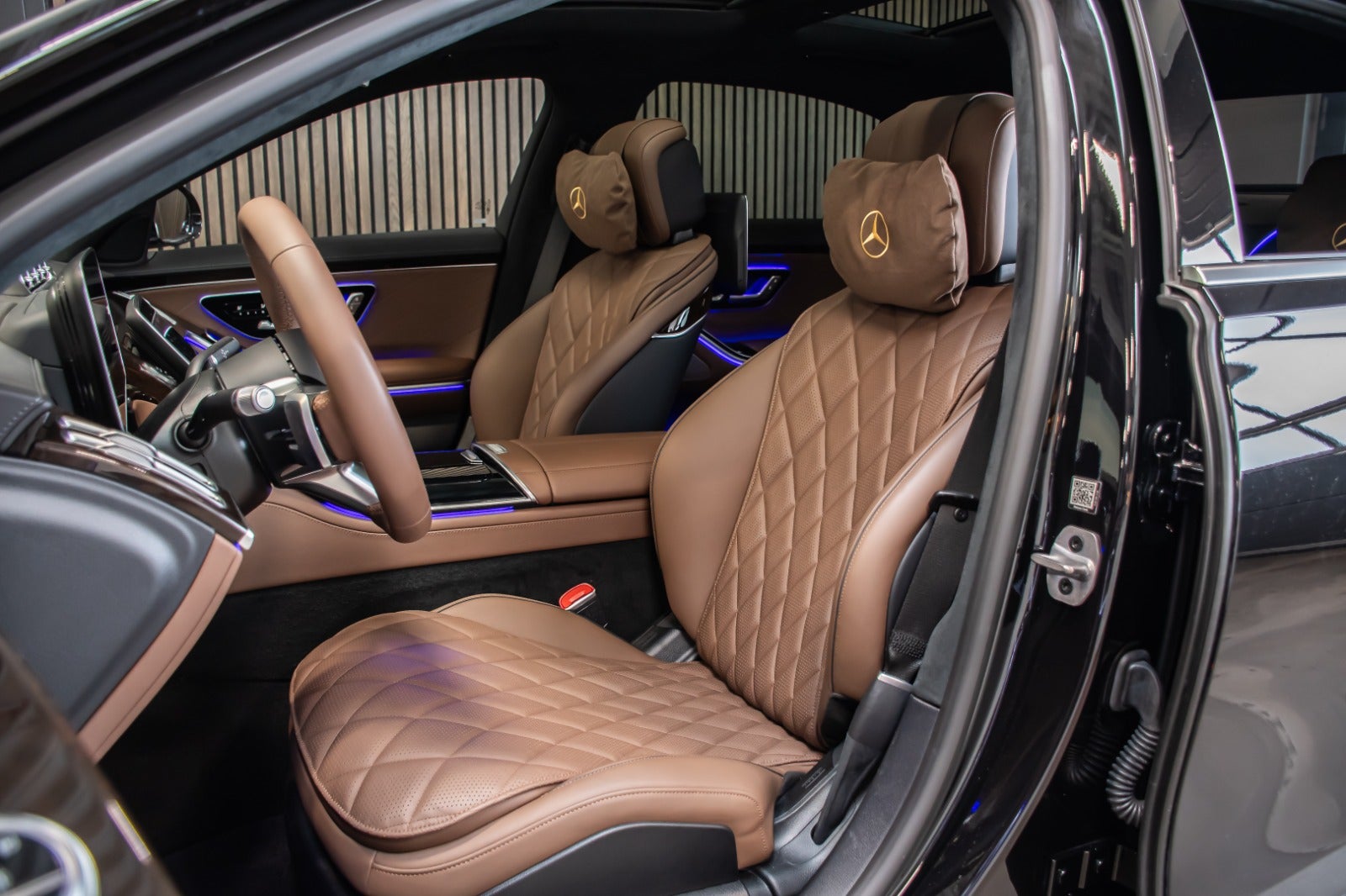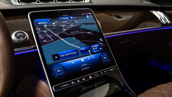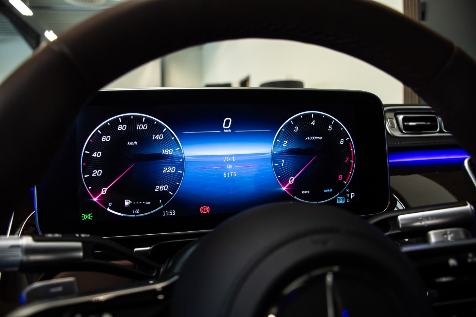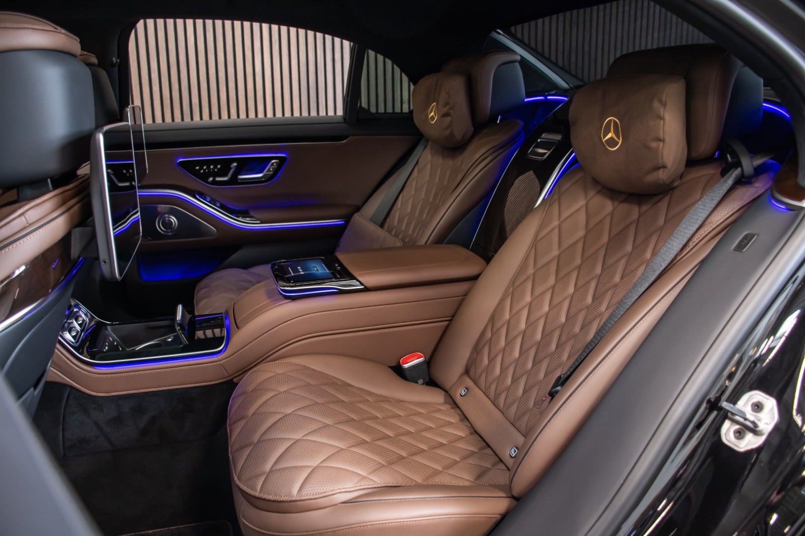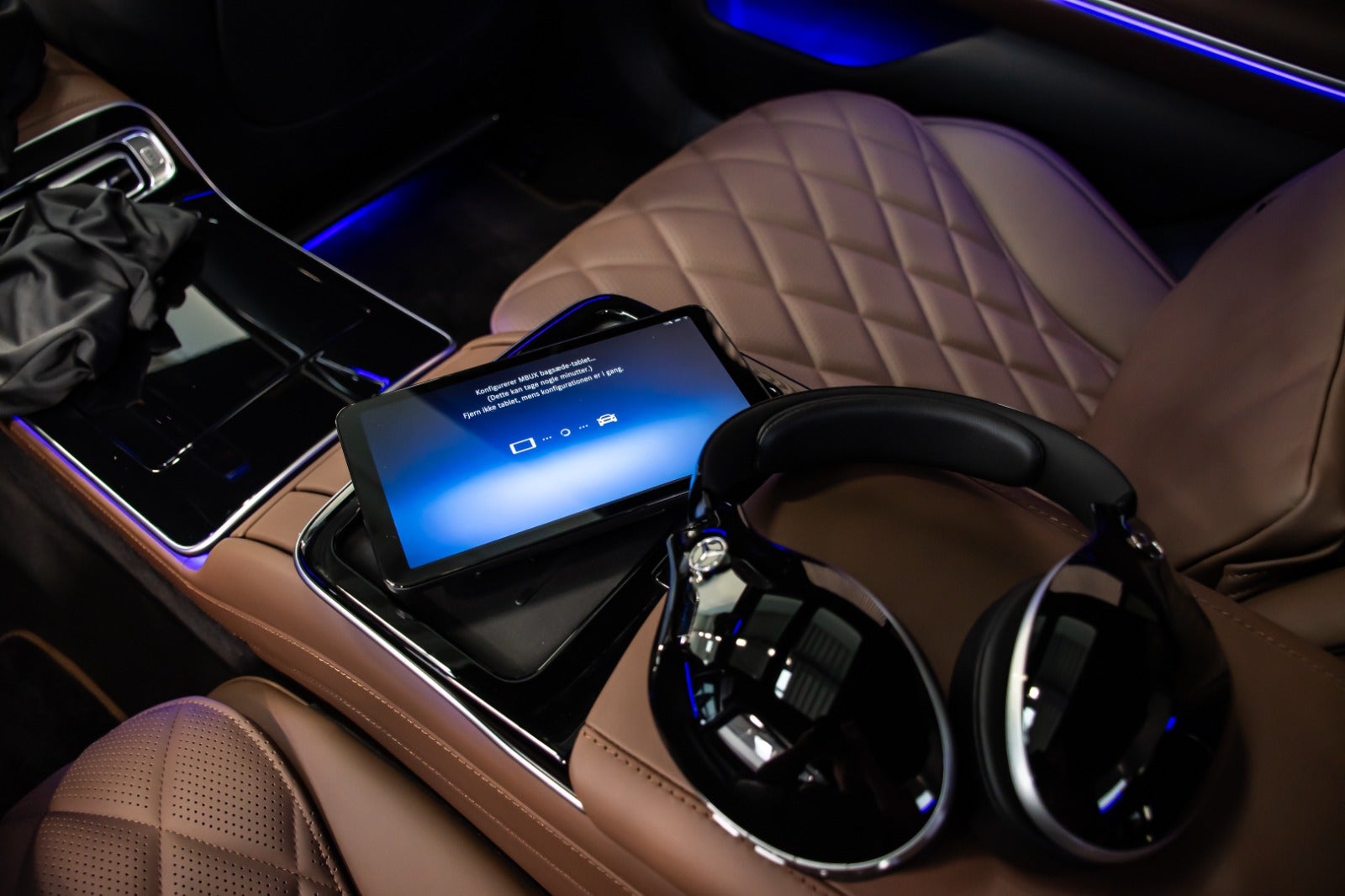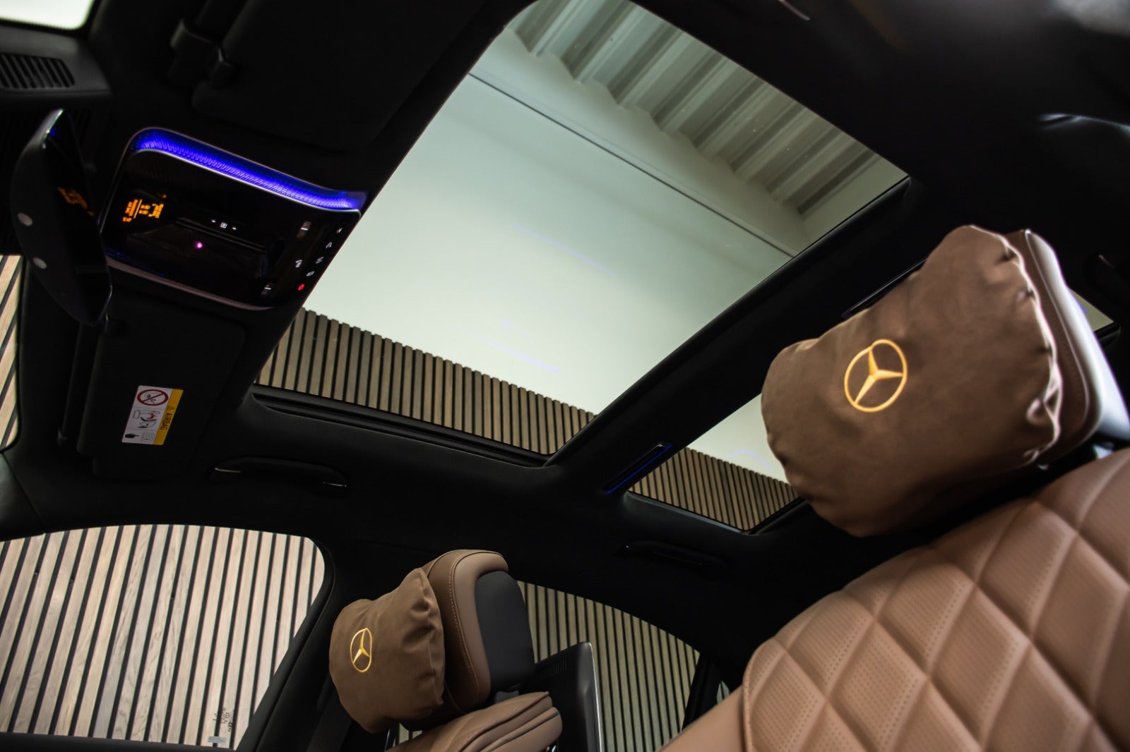 Indvendig kan du tage dig til takke med de store og overdådige Business Class sæder i bag m. varme, køl, massage og selvfølgelig memory. Skal du arbejde, slår du blot cafébordet ud, og trænger du til at se nyheder eller blive underholdt, tænder du blot for MBUX skærmene. Kabinen er prydet med MANUFAKTUR syninger og læder i den særlige MOCCA-brown, og sammen MANUFAKTUR listerne i brun valnøddetræ er det virkelig en perfekt kombination.